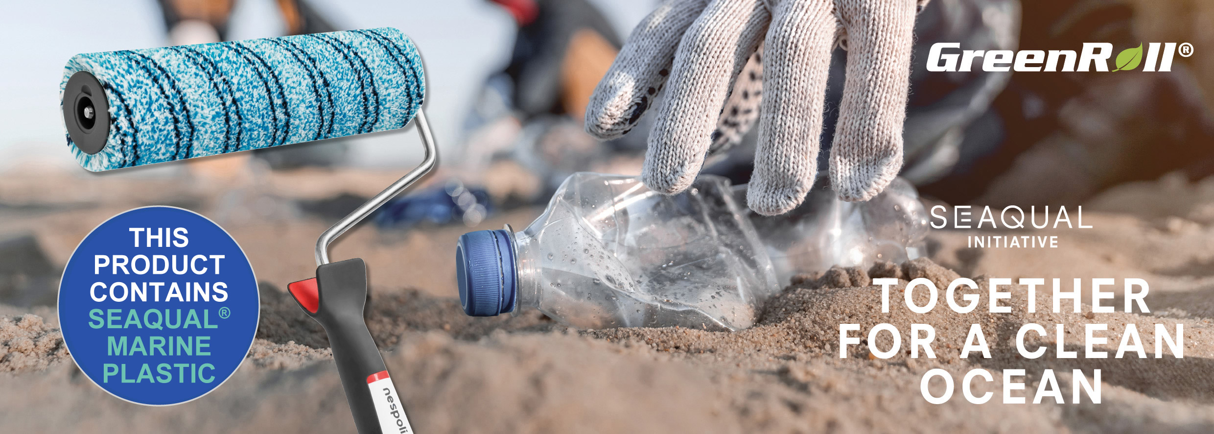 Les rouleaux de peinture GreenRoll® contiennent SEAQUAL® YARN, un fil en polyester de haute qualité, recyclé, fabriqué à partir de plastique marin recyclé. Aideznous à nettoyer nos plages, nos rivières et nos océans.